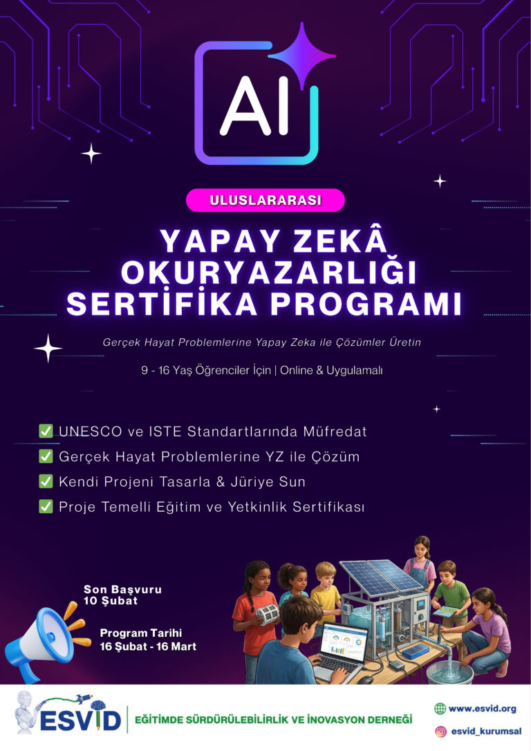 Uluslararası Yapay Zekâ Okuryazarlığı Sertifika Programı, 9–16 yaş arası öğrencilerin yapay zekâyı yalnızca kullanan değil; anlayan, sorgulayan, üreten ve etik boyutlarıyla değerlendiren bireyler olarak yetişmelerini amaçlayan online ve uygulamalı bir eğitim programıdır.